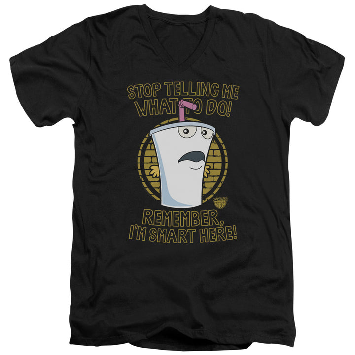This Aqua Teen Hunger Force stop men's t-shirt, has Master Shake saying stop telling me what to do, remember I'm smart here on the front. Front print only.