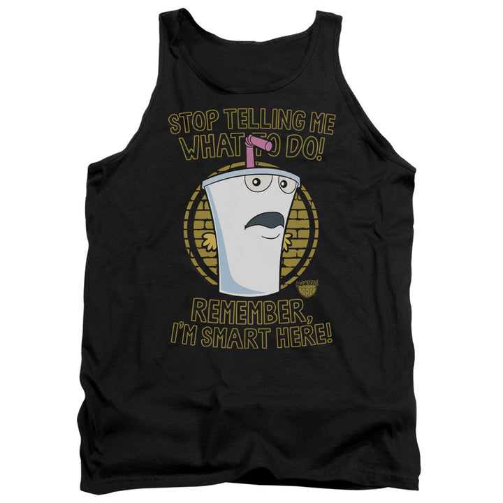 This Aqua Teen Hunger Force stop men's tank top, has Master Shake saying stop telling me what to do, remember I'm smart here on the front. Front print only.