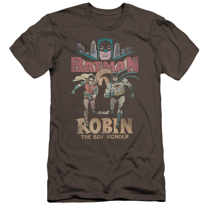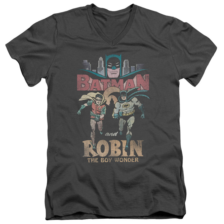 This Batman TV Show classic duo men's t-shirt, has a distressed Batman and Robin graphic running like the TV show intro on the front. Front print only.