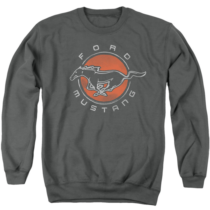 This Ford Mustang circle men's sweatshirt, has a slightly distressed in spots retro graphic of a horse running with Ford Mustang on the front. Front print only.
