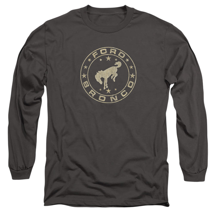 This Ford vintage star Bronco men's long sleeve t-shirt, has a slightly distressed circular graphic with a horse silhouette, stars, and Ford Bronco on the front. Front print only.