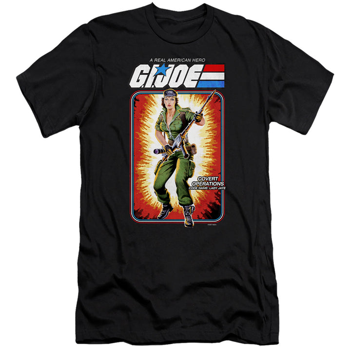 This G.I. Joe Lady Jaye card men's t-shirt, has a portrait of covert operations codename Lady Jaye and the G.I. Joe logo from the cartoon series on the front. Front print only.