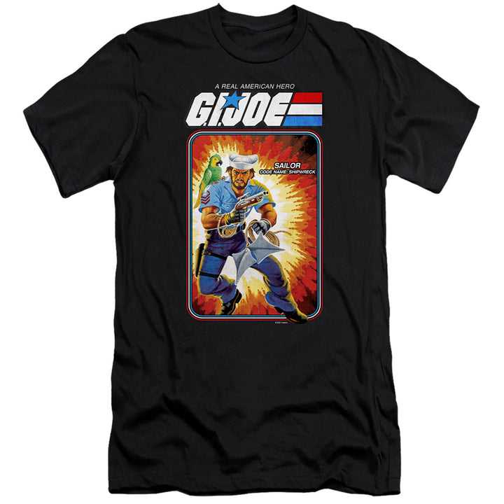 This G.I. Joe Shipwreck card men's t-shirt, has a portrait of the sailor codename Shipwreck and the G.I. Joe logo from the cartoon series on the front. Front print only.