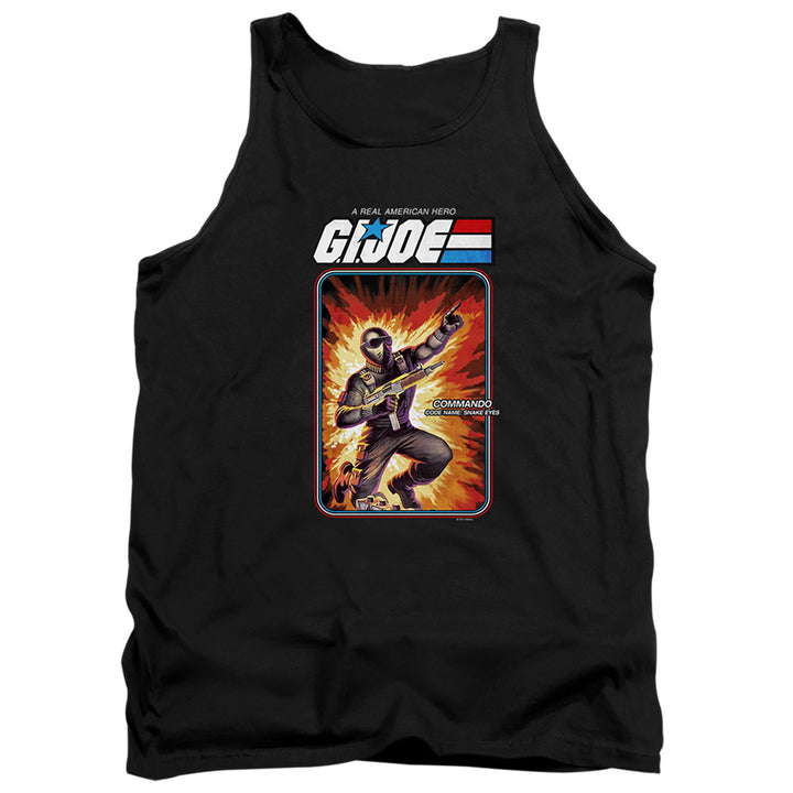 This G.I. Joe Snake Eyes card men's tank top, has a portrait of the commando codename Snake Eyes and the G.I. Joe logo from the cartoon series on the front. Front print only.