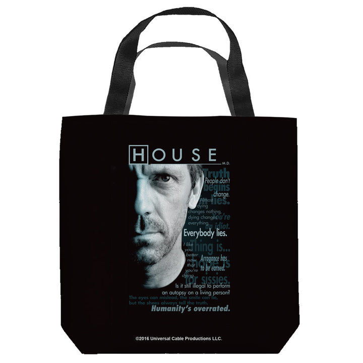 This House M.D. Houseisms tote bag, has a collection of quotes from the tv show of Dr. Gregory House printed on the front and back.