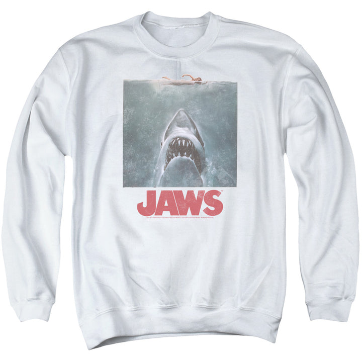 This Jaws distressed jaws men's sweatshirt, has a faded vintage Jaws movie poster graphic on the front. Front print only.