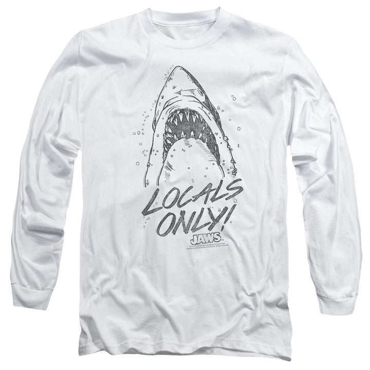 This Jaws locals only men's long sleeve t-shirt, has a black-and-white Jaws shark illustration with the words locals only on the front. Front print only.