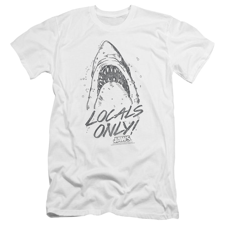 This Jaws locals only men's t-shirt, has a black-and-white Jaws shark illustration with the words locals only on the front. Front print only.