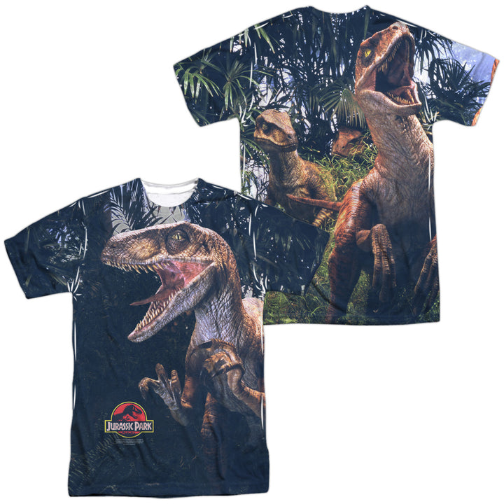 This Jurassic Park raptors sublimation men's t-shirt, has the scary raptor in action from the movie on the front. One sided or two sided versions available.
