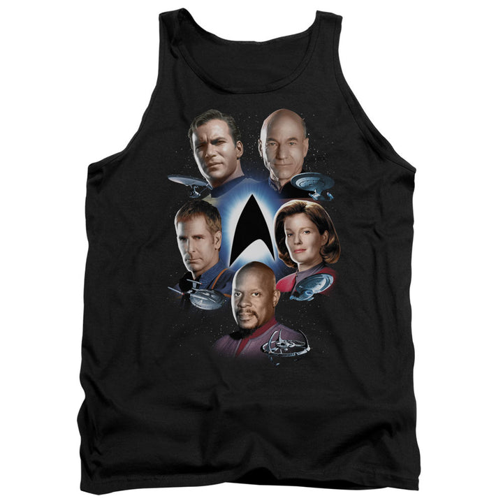 This Star Trek Starfleet's finest men's tank top, has headshots of Kirk, Picard, Janeway, Sisko, and Archer with their ships on the front. Front print only.