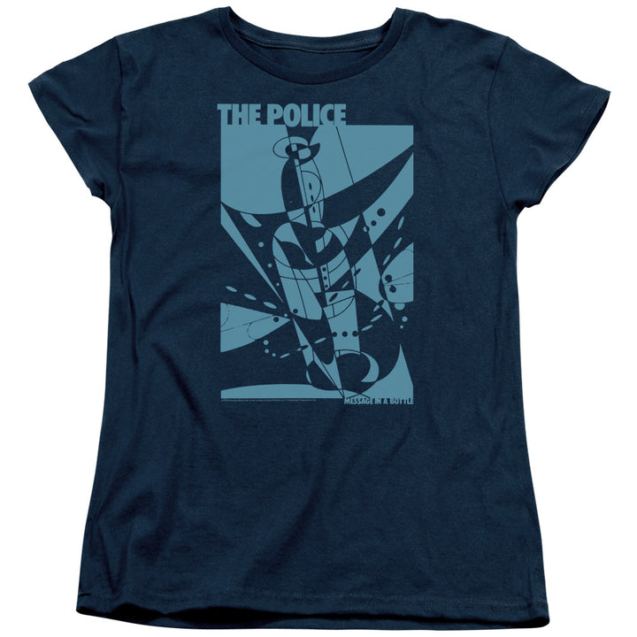 This The Police message in a bottle women's t-shirt, has an artistic line drawing of a bottle in water on the front. Front print only.
