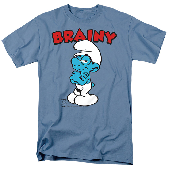 This The Smurfs Brainy men's t-shirt, has Brainy Smurf, the self-centered (more than Vanity) and questionably smartest Smurf on the front. Front print only.