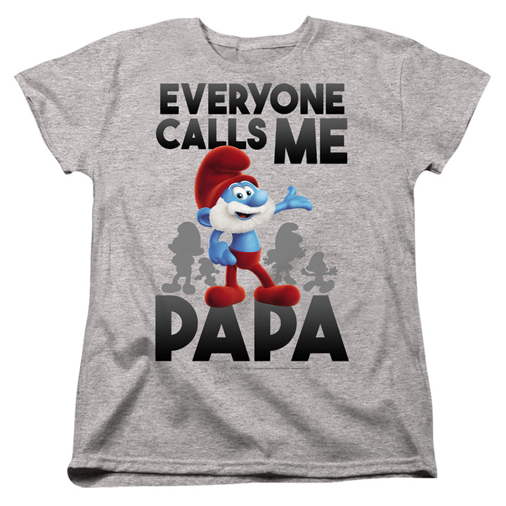 This The Smurfs call me Papa Smurf women's t-shirt, has the gray bearded Papa Smurf with everyone calls me Papa on the front. Front print only.