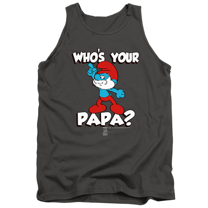 This The Smurfs who's your Papa men's tank top, has Papa Smurf pointing to the words who's your Papa on the front. Front print only.