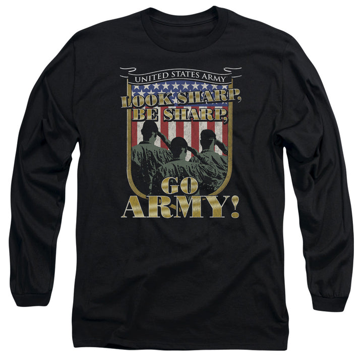 This U.S. Army go Army men's long sleeve t-shirt, has an Army graphic with look sharp, be sharp go Army on the front. Front print only.