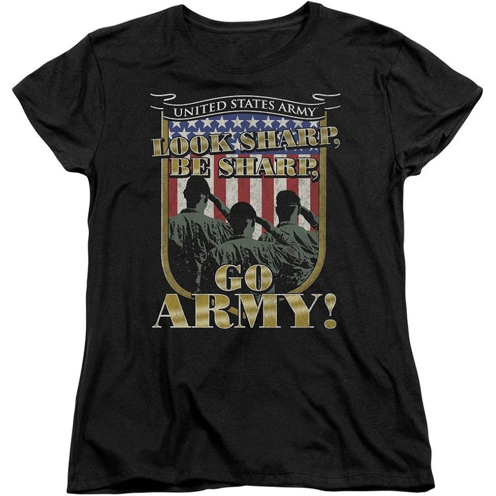 This U.S. Army go Army women's t-shirt, has an Army graphic with look sharp, be sharp go Army on the front. Front print only.